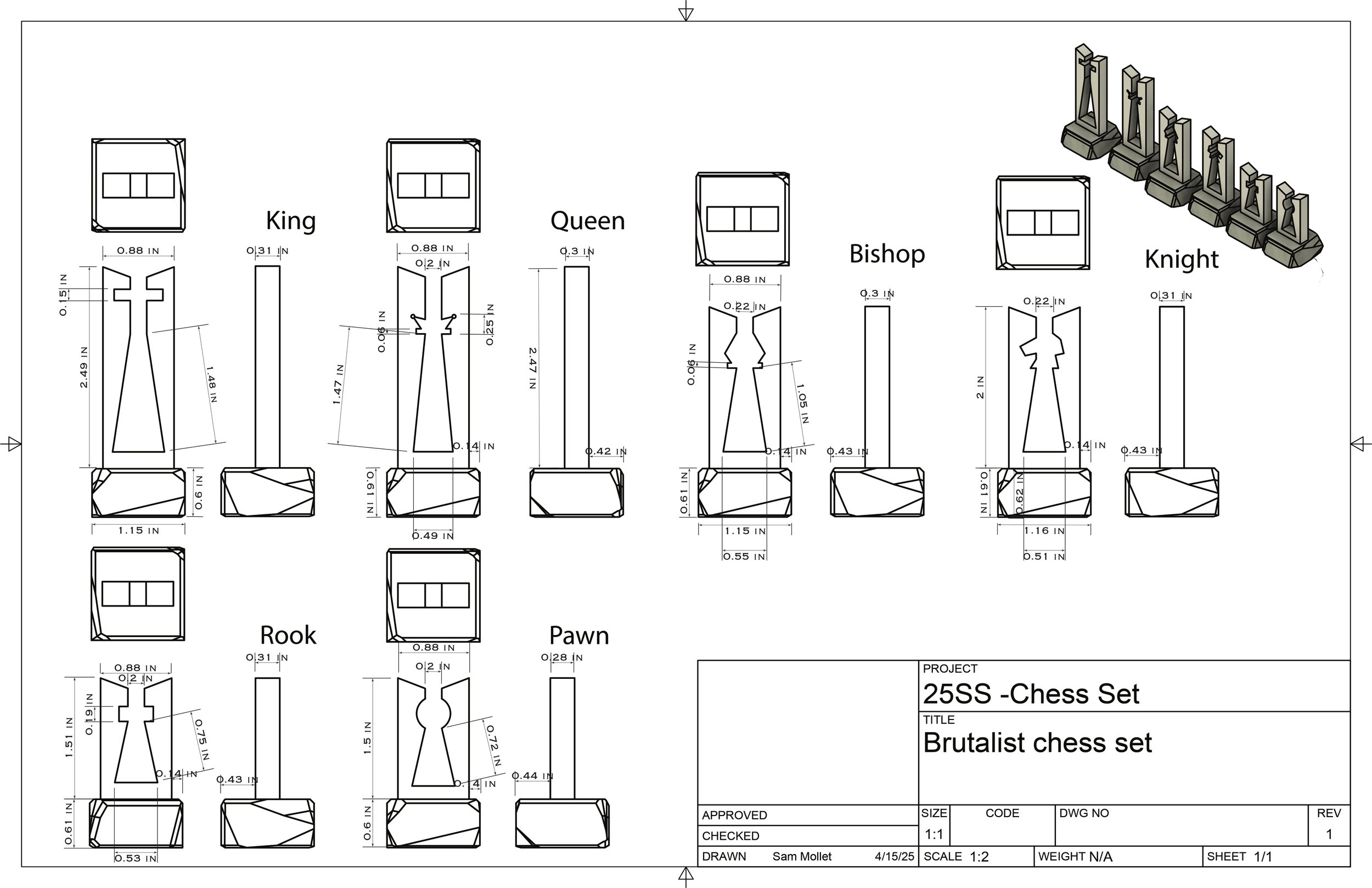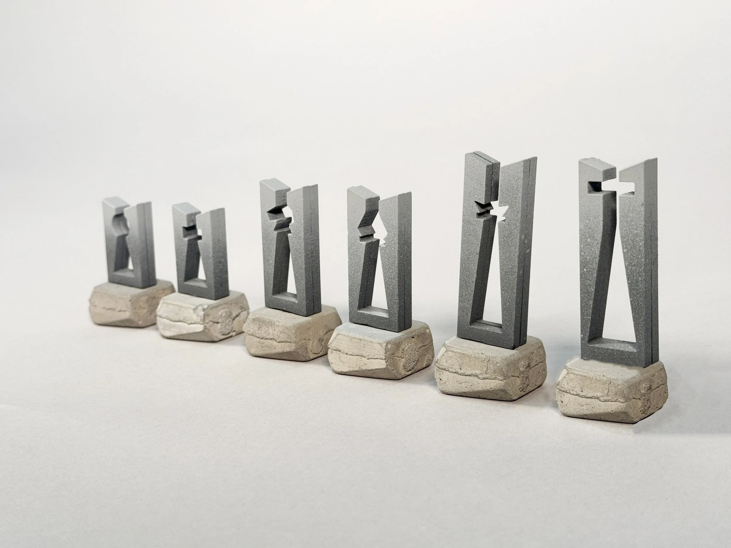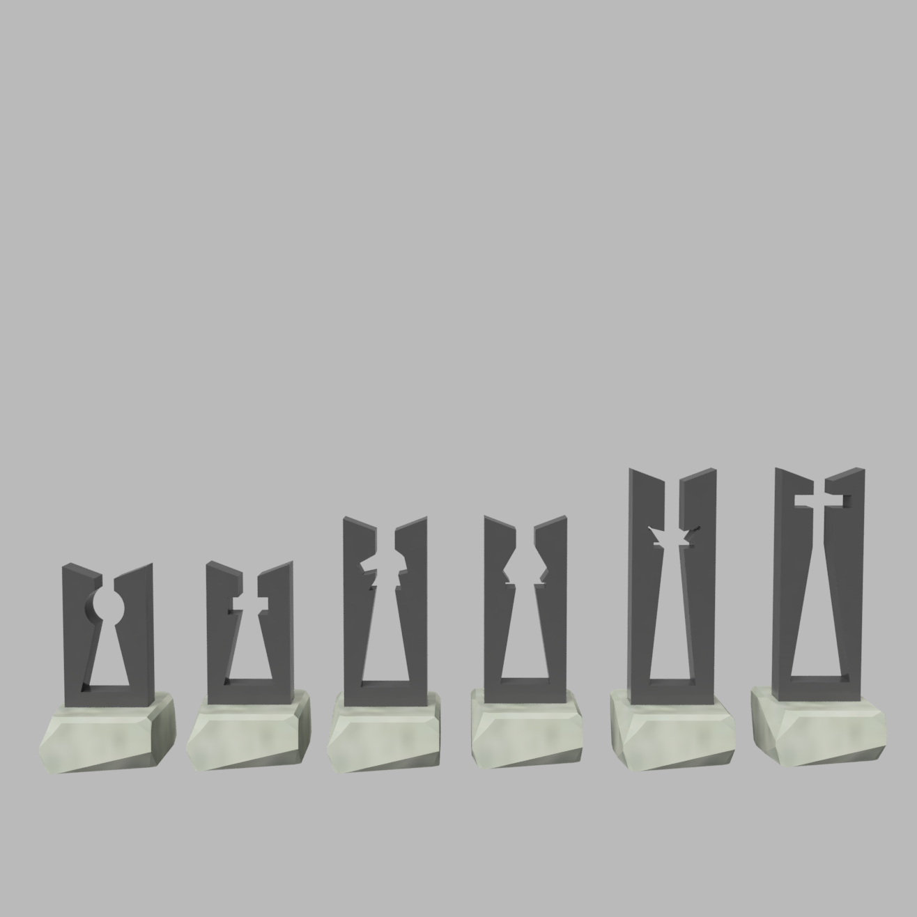 Design a 6-piece chess set with a unified visual language by using a consistent family element across all pieces. Each piece should share clear design features while maintaining its own identity, creating a cohesive and visually connected set.