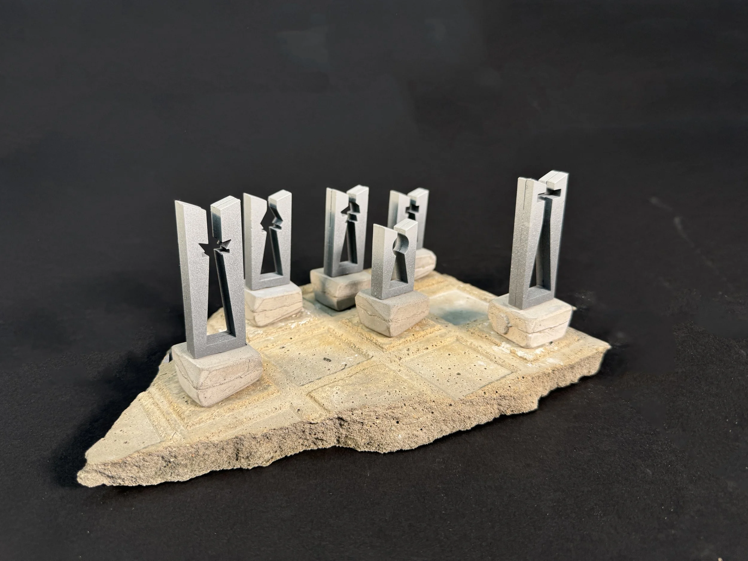 Pictured to the right is my oomoo mold of the master copy pictured above with my concrete base piece before fully drying.
